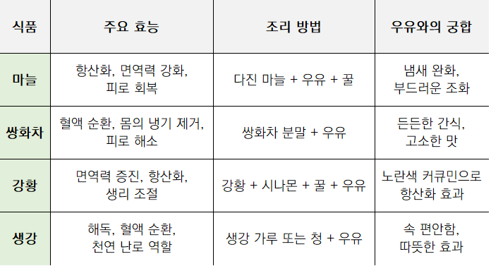 3. 건강 효과 : 마늘과 우유의 조합은 항산화력을 높이고 면역력을 강화하며 피로 회복에도 기여합니다.